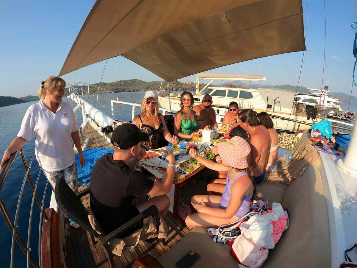Главное отличие — маршрут. Здесь вы не просто катаетесь по знакомым бухтам Мармариса, а отправляетесь в более необычные и красивые точки, где вода, острова и природа создают совсем другую атмосферу.